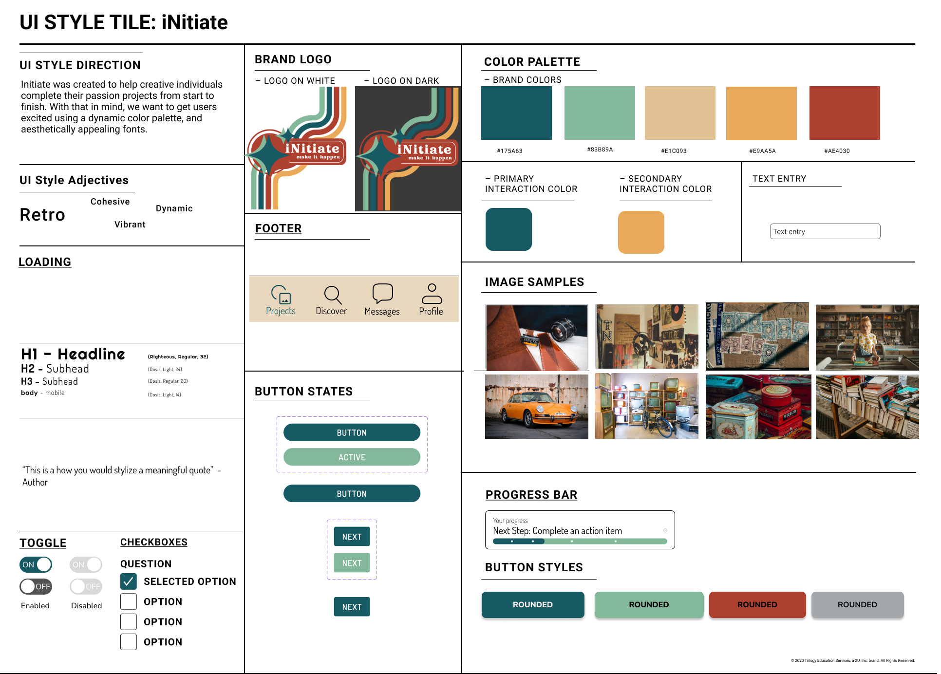 After we finalized our color palette we began creating our UI Style Guide. This guide included our color palette, image samples, button states and more.